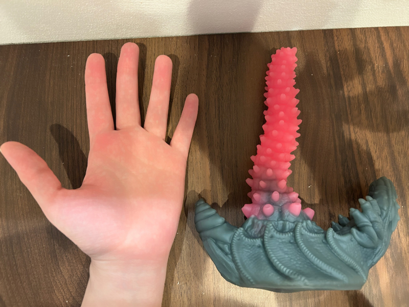 手のひらと比較してみるとこんな感じで、挿入部分は13.5cm、太さは根本を除けば2〜3cm程で細めです。