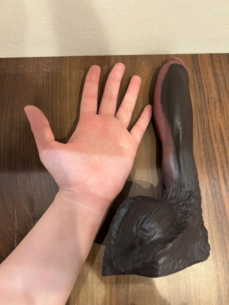 手のひら…というか腕!と比べてみるとこんな感じ。でっ!!!それもそのはず、コチラのウェンカムイはMサイズにして長さ14.8cm。つまり15cm級。でっっっ!!!!!